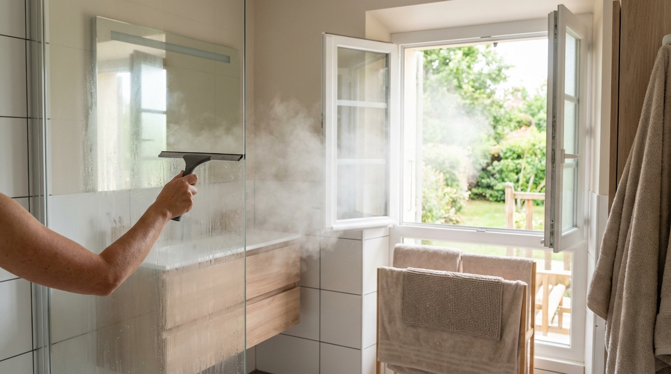 Pour nettoyer sa salle de bain comme un pro, tout se joue en moins de deux minutes après la douche. Raclette sur les parois pour chasser presque toute l’eau, fenêtre entrouverte ou VMC en vitesse haute pour évacuer la vapeur, puis tapis et serviettes mis à sécher hors de la pièce. Ces micro-gestes suffisent à empêcher joints noircis, odeurs et récurages interminables.