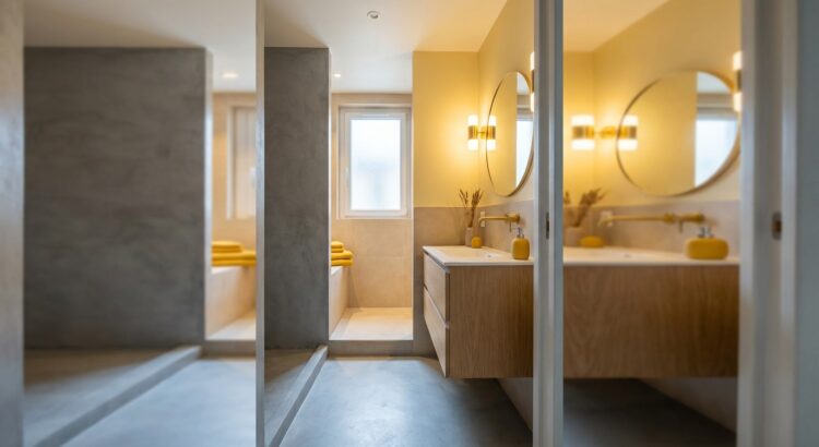 - Rénovation partielle : remplacez un pan de béton par un revêtement crème ou sable, gardez un rappel minéral en niche ou tablette, et misez sur un jaune plus soutenu derrière la vasque pour un effet signature.