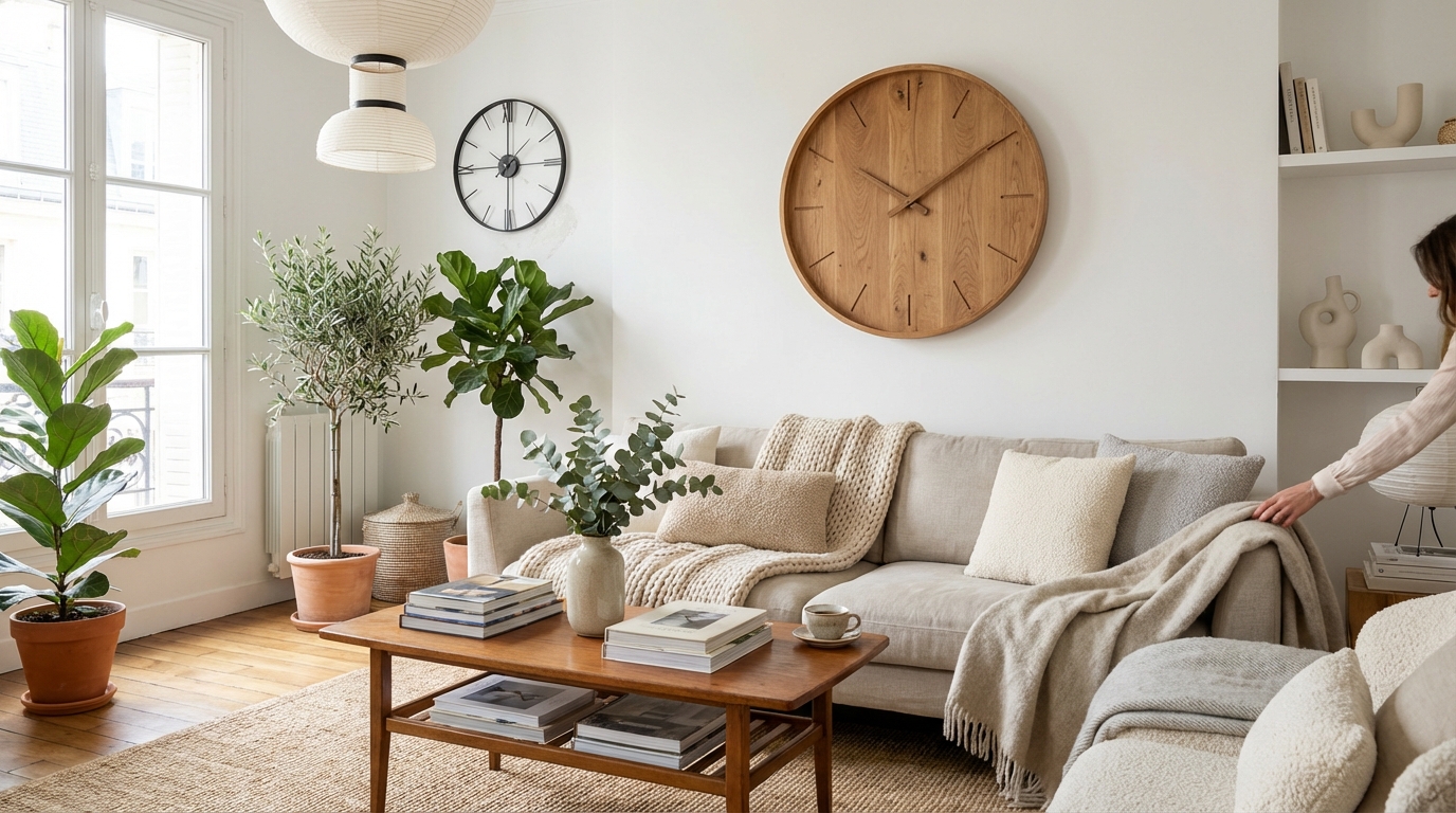 En 2026, la grande horloge industrielle en métal noir qui trône au‑dessus du canapé refroidit plus qu’elle ne décore. D’autres horloges murales, plus organiques et silencieuses, promettent un salon refuge sans refaire toute la déco.