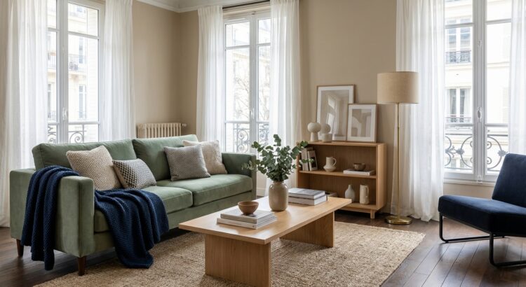 Pour l’hiver 2026, un trio ressort pour transformer un salon ordinaire : beige chaud, vert sauge et bleu nuit. Le beige tirant vers le grège crée une base enveloppante qui remplace le blanc. Le vert sauge apporte la note végétale, le bleu nuit structure l’espace. Les couleurs acides type chartreuse ou fuchsia restent limitées à environ 10 % de la surface visible.
