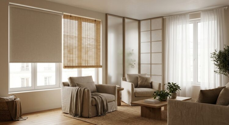 Les plus demandés restent les stores enrouleurs, discrets une fois relevés et parfaits pour les intérieurs épurés. En version tissu, occultant ou tamisant, ils filtrent la lumière sans encombrer l’espace. Les designers apprécient aussi les stores tissés en bois, rotin ou bambou, qui ajoutent de la texture à la fenêtre et réchauffent un salon un peu froid.