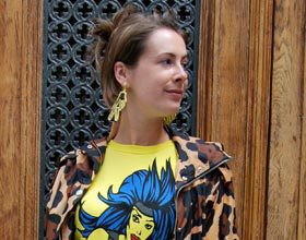 On adore Les pièces phares de la saison sont au rendez-vous ! Parka léopard, T-shirt oversize imprimé, mini bottes en plastique. Un look tout droit sorti des années 80 et une belle démonstration de style !Le plus Des couleurs pop qui ne sont pas sans nous rappeler le look d’une certaine Yelle !