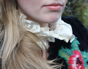 Charlène, c’est une de mes copines. Quand je lui ai parlé de ma mission streetstyle, elle a aussitôt craqué pour les cols d’Olga… Et pas n’importe lequel ! Aimant beaucoup les cols claudine, elle a choisi un col de ce style.Au recto : un imprimé paon en total look. Au verso : du noir pour mieux faire ressortir la couleur sur les extrémités libres. Sans hésitations, Charlène a mis le col du côté verso.