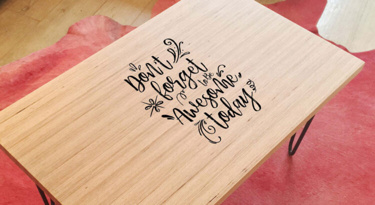 Une table basse où on peut faire inscrire le message qu’on veut ! Voilà ce qu’on appelle du mobilier personnalisé. L’artisan peint les motifs avec deux couches d’encre UV, plus une couche de vernis.