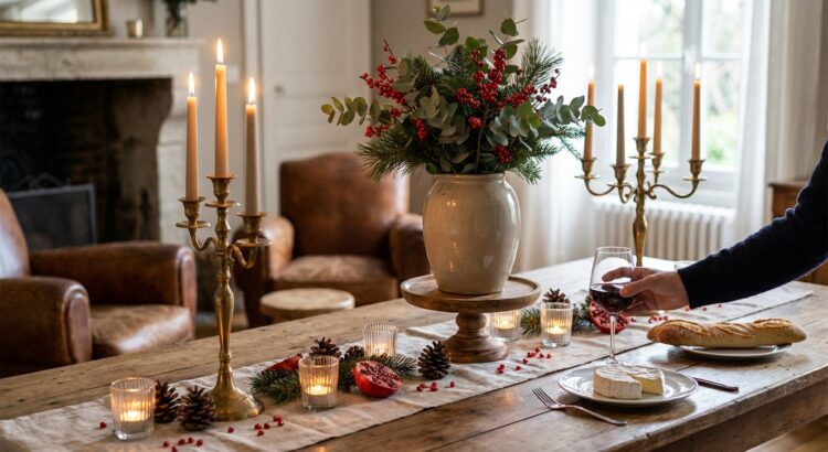 Pour un dîner intimiste, limitez les éléments les plus hauts au centre et multipliez les photophores bas entre les assiettes ; la lumière se diffuse à hauteur de regard et crée immédiatement une atmosphère de cocon. Si vous visez un effet plus spectaculaire, osez un grand centre de table rempli de branches de sapin, de baies rouges ou de fleurs d’hiver, puis faites descendre progressivement les hauteurs avec des verres sur pied travaillés, des candélabres et des plateaux surélevés pour les mignardises.
