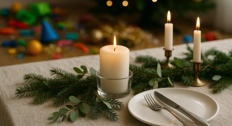 La bonne nouvelle, c’est qu’une table déjà dressée se rattrape vite. Les décorateurs résument leur technique en trois piliers : la base, la nature et la lumière. On commence par une base sobre avec assiettes blanches, nappe écrue ou chemin de table en lin ou coton épais, verres transparents. On retire sans état d’âme la moitié des objets, en gardant seulement quelques pièces fortes bien réparties. Au centre, on regroupe des branches de sapin ou d’eucalyptus, des pommes de pin, un peu de houx, quelques oranges ou grenades pour créer du relief.