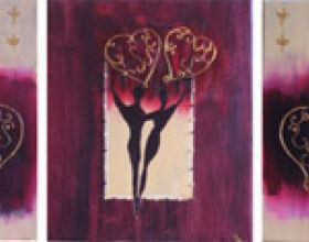 Dessinez au crayon le modèle désiré (Ici, le thème est l’amour, j’ai donc dessiné deux silhouettes dont les jambes finissent par faire un seul et même bloc). Pour ce tryptique, commencez par passer une couche d’acrylique maison couleur prune (mélange de bleu nuit et un peu de rouge vif tirant vers l’orange et un tout petit peu de brun type terre de sienne brûlée). Une fois la première couche sèche, passez avec un pinceau sec, un beige clair très léger. Puis peignez en rose très clair la partie pour les coeurs avec des couches de plus en plus foncées et tirant à nouveau vers le prune.