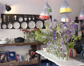 Pour le reste le petit magasin est un joyeux bric-à-brac de deux étages où se mêlent rangements, luminaires, miroirs, horloges, fleurs. Autant d’accessoires à l’image de leur univers : créatif et gai ! On retrouve tous les best-sellers qui ont fait leur succès : vase d’Avril, guirlande cubiste, vaisselle  » Affamée « .