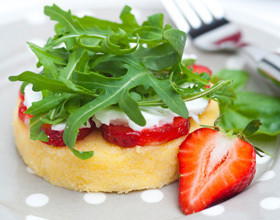 Une polenta découpée à l’aide d’un emporte-pièce, nappée de tranches de fraises et morceaux fromage frais, surmonté de roquette et de basilic. Rachel a un dilemme : quelle assiette choisir ? A fleurs ou à pois gris. Au final, le motif gris l’emporte, un joli contraste avec le rouge et le vert.