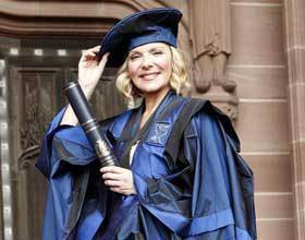 L’actrice née à Liverpool a passé la majeure partie de sa vie au Canada et voilà que sa ville d’origine lui rend hommageEn effet, elle a reçu le 12 juillet 2010 un diplôme honorifique de l’université de John Moores de Liverpool pour sa contribution au monde de l’art ! Entourée de ses proches et vêtue d’une longue cape bleue et du couvre-chef traditionnel des jeunes diplômés, Kim Cattrall avait l’air ravie !