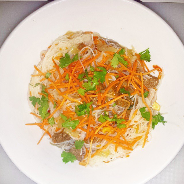 Faites revenir le tout dans une poêle avec un peu de beurre. Une fois cuit, ajoutez le mélange aux vermicelles de riz, remuez, et servez dans des assiettes creuses.