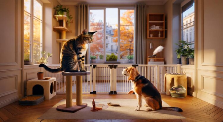 On évite la rencontre frontale. L’introduction progressive reste la méthode la plus sûre pour limiter l’escalade. Au départ, chaque animal dispose de son espace, avec gamelle, eau et litière séparées. On échange les odeurs à l’aide d’un linge, on autorise des aperçus visuels courts, puis on allonge doucement le temps en commun.