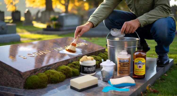 La mousse adore l’humidité. Pour l’enlever sans abîmer la pierre tombale, diluez 3 cuillères à soupe de bicarbonate dans 1 litre d’eau tiède. Imbibez une brosse souple, frottez les zones vertes, puis rincez soigneusement. Le savon noir fonctionne aussi, avec un geste léger. Pas besoin de produit agressif.
