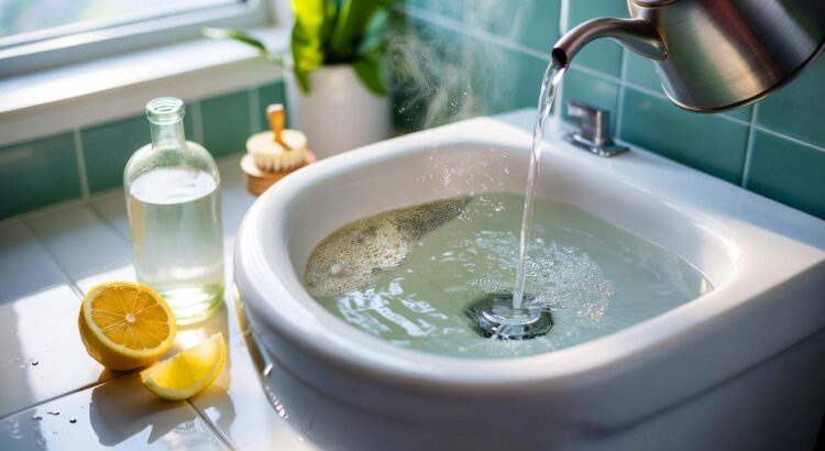 - Versez un demi-litre de **vinaigre blanc** au fond de la **cuvette**, ajoutez le jus d’un **citron**, puis complétez avec de l’**eau bouillante**.