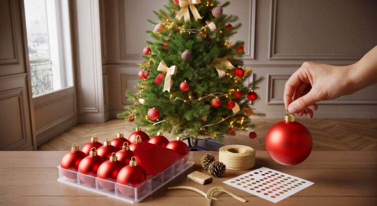 Autre bonne idée: marier quelques décorations neutres déjà présentes chez vous avec les rouges du coffret pour créer du contraste. On obtient alors un sapin très lisible, lumineux, qui ne nécessite ni recherche longue ni budget additionnel. Chacun peut ensuite ajouter un sujet souvenir ou une étoile héritée de la famille pour signer l’ensemble.