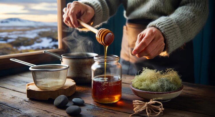 Dans beaucoup de foyers islandais, le geste reste le même : une décoction de mousse d'Islande mêlée à du miel brut. Les proportions courantes sont simples et tenues en mémoire d’hiver en hiver.