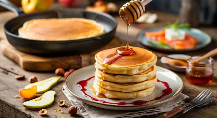 Pour une jolie présentation, empilez les pancakes dorés, nappez d’un trait de miel, ajoutez quelques noisettes torréfiées et des fruits de saison découpés finement. Une assiette colorée ou un plat en bois souligne l’allure maison tout en mettant l’accent sur le côté généreux. Visuellement, ça donne envie, et côté goût, la ricotta garde la main sur l’équilibre.