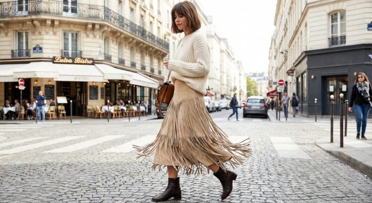 La réalité est tout autre : une nouvelle génération de jupe à franges longue s’est imposée, vue sur les podiums, sur Instagram et dans les rayons des grandes enseignes. Longueurs midi ou maxi, matières nobles, allure boho-chic très travaillée… Plusieurs titres mode français expliquent qu’elle a même pris la place de la jupe en daim cet hiver, avant d’être annoncée parmi les grandes tendances du printemps-été 2026. Le secret tient à quelques détails très précis.