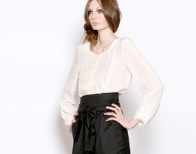 Des pantalons carottes, noir, tailles hautes, voir Gat Rimon, sur des chemisiers ton pastel, en satin, en soie. Des rubans, des nuds…