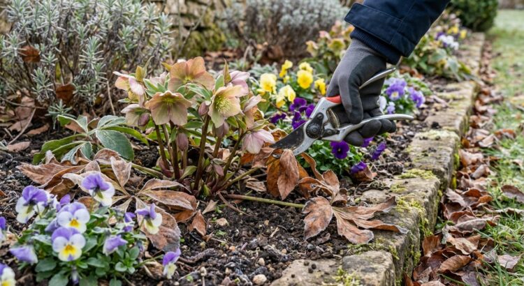 Pour les pensées et violas, tout se joue dans le nettoyage régulier : pincer les fleurs fanées empêche la plante de se fatiguer à produire des graines et relance sans cesse de nouveaux boutons. Au passage, on enlève aussi les feuilles brunies des bergenias pour dégager leurs hampes florales roses prêtes à s’épanouir. En pratique, ce passage peut tenir en trois gestes simples :
