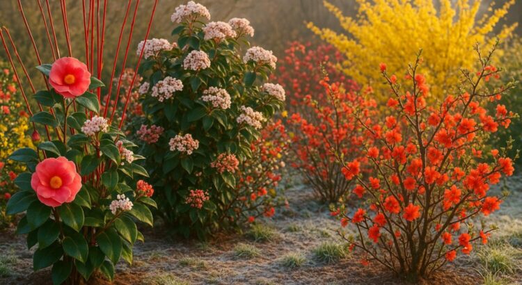 Pour un calendrier de couleur bien réglé, cinq arbustes à floraison précoce font la différence. Le cornouiller offre, en plein hiver, des tiges rouges, jaunes ou orange qui réveillent les bordures. Le laurier-tin illumine les haies par ses ombelles blanches à rosées dès janvier. Viennent ensuite le camélia, le cognassier du Japon et le forsythia, qui prennent le relais entre fin d’hiver et mois de mars.