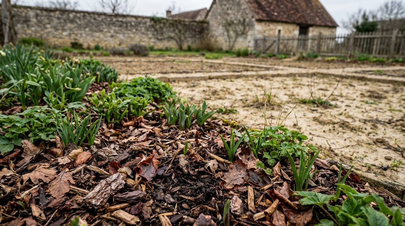 Les jardiniers anglais couvrent le sol tôt dans la saison parce qu’une couche de matière organique agit comme un véritable bouclier thermique. En hiver, ce manteau emprisonne de l’air, isole les racines et la microflore, freine la pénétration du gel. La pluie n’écrase plus la terre : elle traverse en douceur le paillis et garde la structure grumeleuse dont rêvent tous les jardiniers.