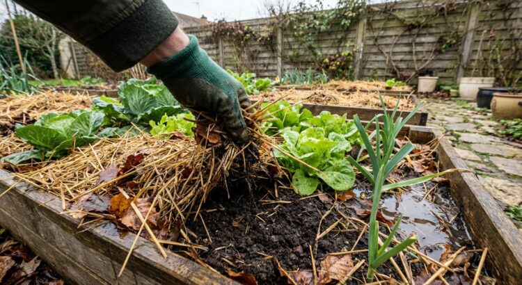 Quand la terre draine correctement, il vaut mieux laisser le paillage en place. Il limite l’évaporation, nourrit la vie microbienne, prévient l’érosion et garde un sol meuble en sortie d’hiver. Un paillage d’hiver sec et aéré posé en couche de 4 à 5 cm protège la structure du sol tout en le laissant respirer.