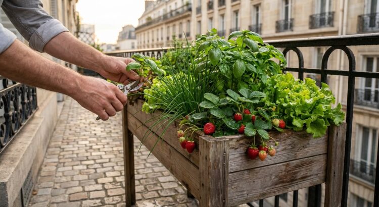 Un carré potager en bois surélevé qui tient sur un balcon