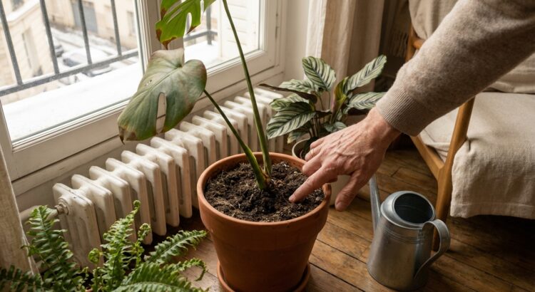 Calathea, alocasia, monstera ou fougères, habituées à un air saturé d’eau, vivent ce contraste comme un choc. Feuilles molles, bords brunis, taches jaunâtres, terre craquelée signalent un manque d’eau et d’humidité. Dans ce contexte, l’arrosage des plantes d’intérieur en hiver ne peut plus suivre un calendrier fixe : tout se joue dans l’observation du substrat et de l’ambiance de chaque pièce.