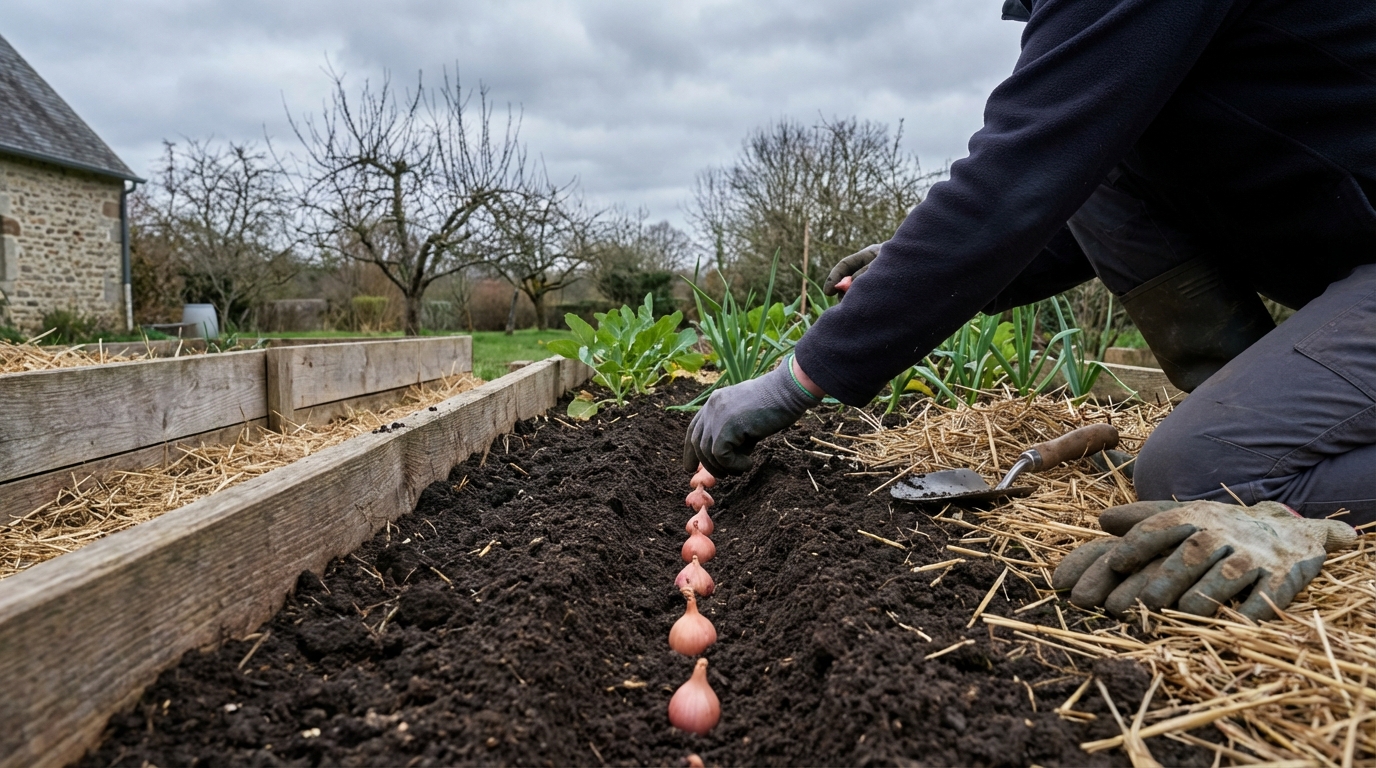 Pour ce bulbe, tout se joue entre la mi-février et la mi-mars, quand le sol se réchauffe doucement autour de 8 à 12 °C. Ce démarrage précoce lui laisse le temps de développer un système racinaire solide avant les grosses chaleurs, gage de bulbes bien gonflés et tendres, moins piquants. On plante les caïeux tous les 10 à 15 cm, avec 25 à 30 cm entre les rangs, en les enfonçant au doigt de façon à ce que la pointe affleure juste la surface.