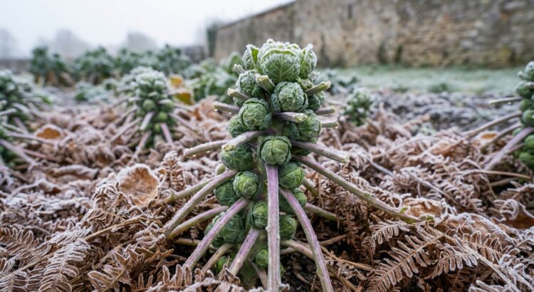 Les choux de Bruxelles supportent bien les températures proches de 0 °C, mais ils deviennent beaucoup plus vulnérables lors des nuits très froides ou des coups de froid tardifs. Un gel trop vif fendille les tiges, ramollit les petites pommes et freine la reprise au printemps, ce qui peut condamner une partie de la rangée. L’humidité stagnante autour du pied favorise aussi moisissures et maladies cryptogamiques, redoutées pour ce légume d’hiver.
