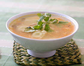 1. Pelez la pomme de terre et coupez-la en petits dés. Placez-la dans une casserole avec le bouillon, montez à ébullition et laissez cuire 20 min.2. Coupez la carotte en julienne.3. Réhydratez les champignons noirs dans de l’eau bouillante durant 10 min puis égouttez-les et coupez-les en lanières fines.4. Mixez le bouillon et les pommes de terre.5. Remettez-le dans la casserole avec la julienne de carotte et les champignons noirs. Faites cuire pendant 10 min.6. Ajoutez les ravioles, séparez-les délicatement et faites-les cuire pendant encore 10 secondes après qu’elles soient remontées à la surface.