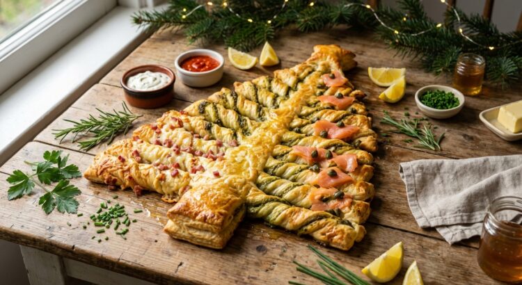 Ce sapin feuilleté de Noël, doré à souhait, se partage dès la sortie du four et se garnit selon les envies : jambon cru et comté, pesto parfumé ou saumon fumé citronné. Le principe reste ultra simple, l’effet visuel bluffant. Il suffit de quelques gestes pour transformer deux pâtes feuilletées en centre de table spectaculaire.