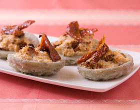 – 4 curs d’artichauts cuits- 50 g de fromage de chèvre frais- 6 tomates confites- 1 cuillère à soupe de chapelure