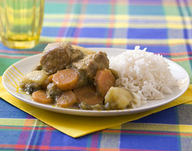 – 700 g de porc à mijoter- 4 pommes de terre- 4 carottes- 1 aubergine- 4 oignons nouveaux- 50 cl de bouillon de légumes- 2 cuillères à soupe d’épices pour colombo- sel- poivre- piment