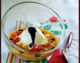 Crème glacée au chèvre coulis tiède de carotte, tomate et caramel balsamique