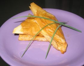 Ces croustillants d’aubergines peuvent se servir aussi bien en entrée qu’en apéritif. A ce moment là, faites des triangles plus petits ! J’ai déjà testé cette recette avec du parmesan et en remplacant la ciboulette par du basilic. C’est très bon…