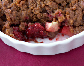 1 – Rincez les mûres sous l’eau froide. Pelez la pomme et coupez-la en petits dés. Répartissez les fruits dans deux petits ramequins.2 – Préparez la pâte à crumble : mixez grossièrement les spéculoos. Ajoutez le beurre en morceaux et la farine. Mixez de nouveau rapidement.3 – Répartissez la pâte à crumble sur les fruits. Faites cuire 15 à 20 min dans le four préchauffé à 180 deg C.