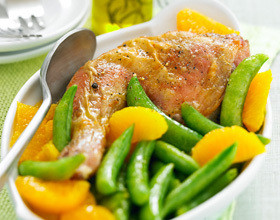Cuisses de poulet fermier marinées à l'orange et pois gourmands