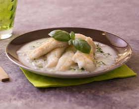 – 400 à 500 g de filets de merlan- 1 oignon- 30 cl de lait de coco- 15 feuilles de basilic- 1 cuillère à soupe de gingembre frais râpé- sel- farine