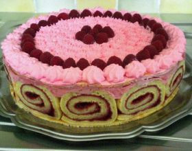 Déposez un disque de génoise dans un plat de service et imbibez-le de sirop (liqueur de framboises et eau) et découpez en tranches le biscuit roulé à la confiture. Disposez un cercle à pâtisserie autour du disque et placez tout autour les tranches de biscuit roulé.