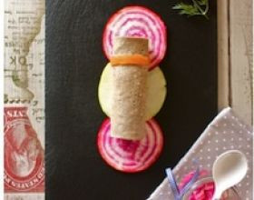Pour le montage : A l’aide d’une mandoline, découper des rondelles de chioggia et de pomme. Au pinceau, badigeonner les tranches d’huile d’olive. Déposer sur une assiette une rondelle de chioggia – une rondelle de pomme – une rondelle de chioggia, en les alignant. Recouvrir la galette de fromage frais, ajouter des lanières de saumon fumé. La rouler, l’entourer à une extrémité d’une lanière de saumon fumé. Déposer la galette sur les rondelles de pomme et chioggia.