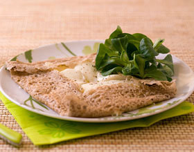 – 2 galettes de blé noir- 1 boule de mozzarella (100 à 125 g)- 60 g de fromage de chèvre type crottin- 40 g de comté râpé