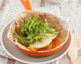 Galettes de blé noir au saumon, pommes, roquette et crème fouettée au citron