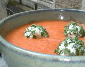 Vous aimez les soupes froides pour l'été ? Essayez ce gaspacho à la tomate accompagné de billes de chèvre !