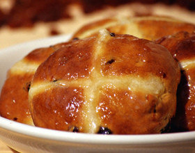 Pour les buns : 1 sachet de levure de boulanger sèche 500 g de farine1 pincée de sel 50 g de beurre50 g de sucre 1 cuillère à café de cannelle en poudre 1 cuillère à café de gingembre en poudre 125 g de raisins secsle zeste d’une orange et d’un citron 15 cl de lait tiède7,5 cl d’eau tiède1 oeuf légèrement battu
