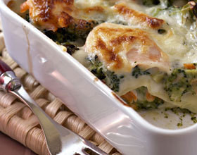 1. Faites cuire le saumon à la vapeur pendant 15 min. Détaillez le brocoli en petits bouquets et faites-les cuire 10 min dans une grande casserole d’eau bouillante salée.2. Préparez une sauce béchamel en faisant fondre le beurre dans une petite casserole. Ajoutez la farine et mélangez avec un fouet pour former un roux blanc. Délayez avec le lait petit à petit. Salez et poivrez. Laissez cuire une dizaine de minutes sur feu jusqu’à ce que la préparation épaississe.3. Déposez un peu de béchamel dans le fond du plat puis une couche de lasagnes.4. Alternez ensuite les couches de saumon, brocolis, béchamel et lasagnes jusqu’à épuisement des ingrédients.5. Saupoudrez de gruyère râpé et faites cuire 30 min à 180degC.