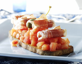 – 4 tranches de pain grillé Pelletier à la farine de Froment- 200 g de jambon espagnol coupé en tranches très fines- 8 tomates- 2 gousses d’ail- 8 cuillerées à café d’huile d’olive- sel et poivre