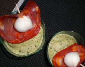 Petits bavarois à la courgette, brochette de chorizo et mozzarella