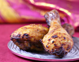 1. Enlevez la peau du poulet. Piquez les cuisses avec une fourchette ou faites quelques entailles avec un couteau. Salez-les.2. Mélangez le yaourt avec l’ail dégermé et écrasé, le jus de citron, les épices et le colorant.3. Badigeonnez les cuisses de ce mélange et laissez mariner de 6 h à 1 nuit au réfrigérateur.4. Préchauffez le four à 220degC. Posez les cuisses sur une plaque recouverte de papier aluminium. Enfournez et laissez cuire 30 min, en arrosant de ghee ou d’huile en cours de cuisson.
